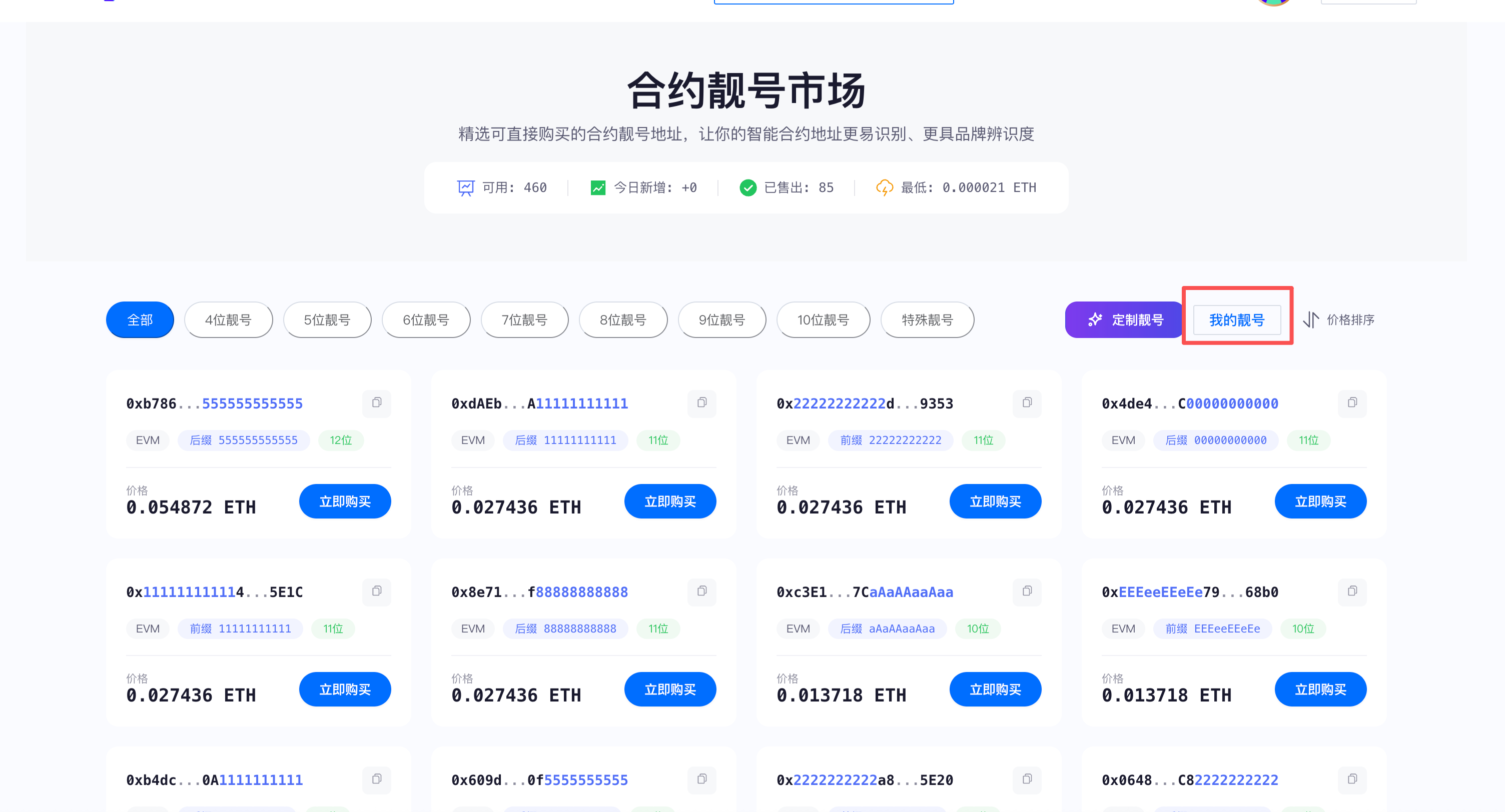 The platform pre-discovers and stores a large number of high-quality vanity addresses, covering multiple common styles to quickly match brand tone: